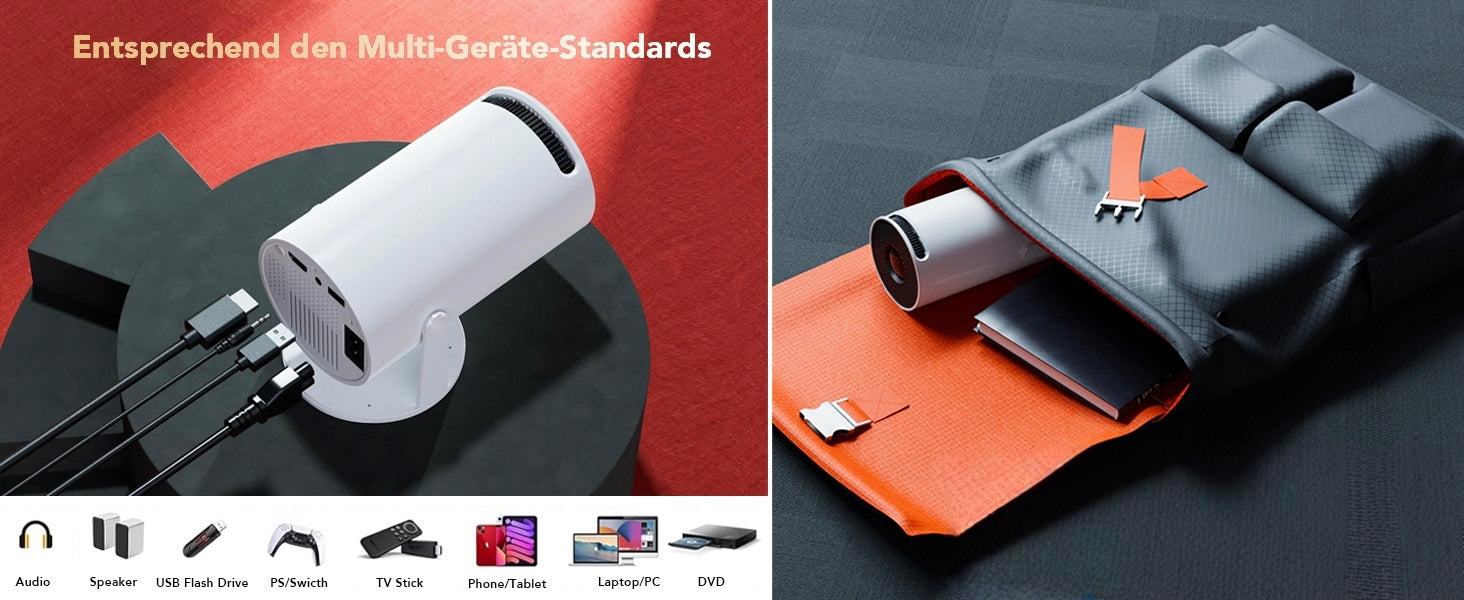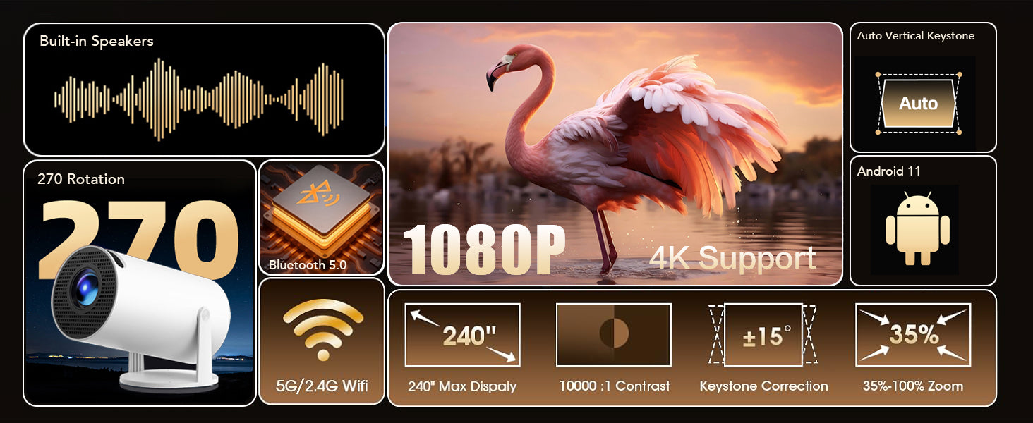 Portable Projector 4K 1080P FHD Mini Projector, Compatible with Android and Netflix, WiFi 6, BT 5.0, 180° Rotation, Projector with Automatic Keystone Correction